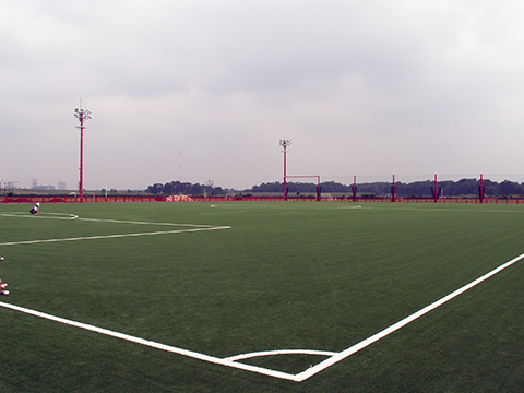 ⼈⼯芝ピッチの設置にあたっては、河川敷という⽴地上の制約が大きな課題となり、調節池の機能を担う区域に位置しているため、従来のゴムチップ充填材を使用すると、冠⽔時に流出してしまうおそれがありました。そこで、さまざまな素材を検討した結果、当時国内での導⼊例が少なかった「ノンフィル方式(充填材を使用しない⼈⼯芝)」を採⽤しました。柔らかい⼈⼯芝と硬い⼈⼯芝を組み合わせることで、コストは割⾼ながらも、プレーへの影響を最小限に抑える高品質なピッチを実現。新素材を取り入れたこの取り組みは、全国のスポーツ団体・組織から注⽬を集めました。