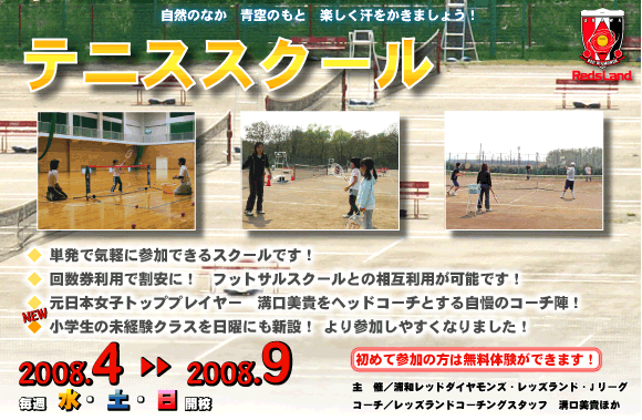 当日はラケット・飲料などを持参のうえ、テニスのできる服装・シューズでお越しください。なおシューズは、テニスシューズもしくは運動靴(裏面に凸凹がないもの)をご使用ください。 |