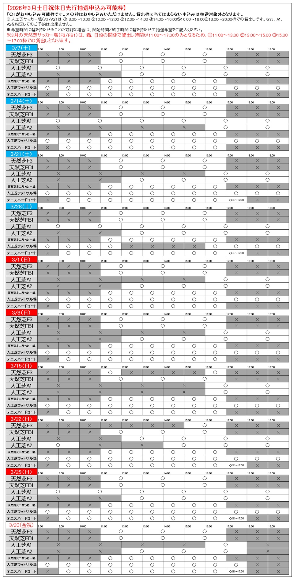 ※サッカー場の抽選申込みは2時間枠での申込み受付となります。