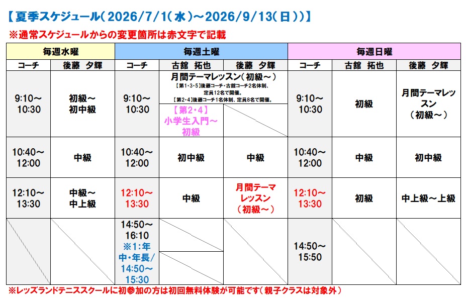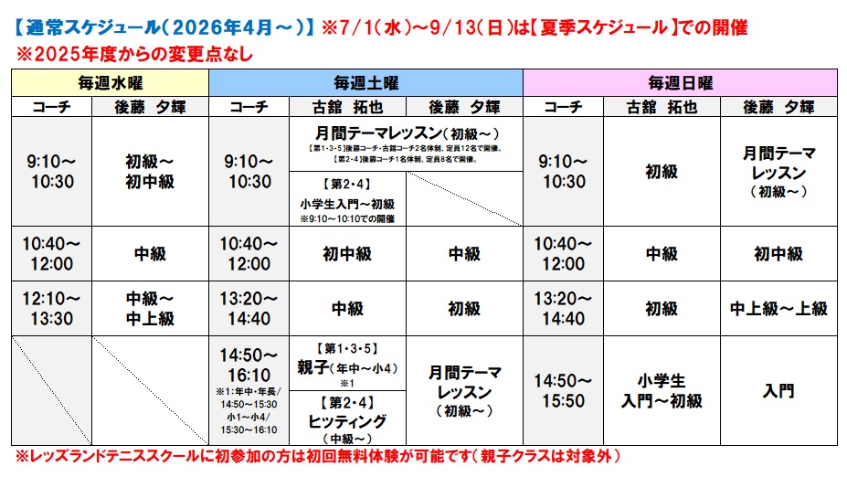 ・日曜日13:20~14:40のクラスの開催時間が、12:10~13:30に変更となります(2025年度夏季から継続)。