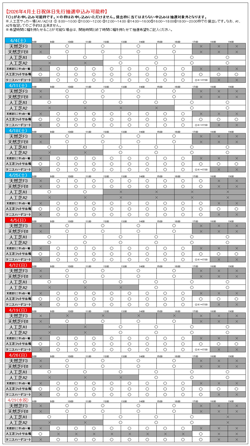 ※平日は4/1(水)10:00~16:00の人工芝サッカー場、4/3(金)10:00~16:00の人工芝サッカー場以外は先行抽選申込可能枠です。