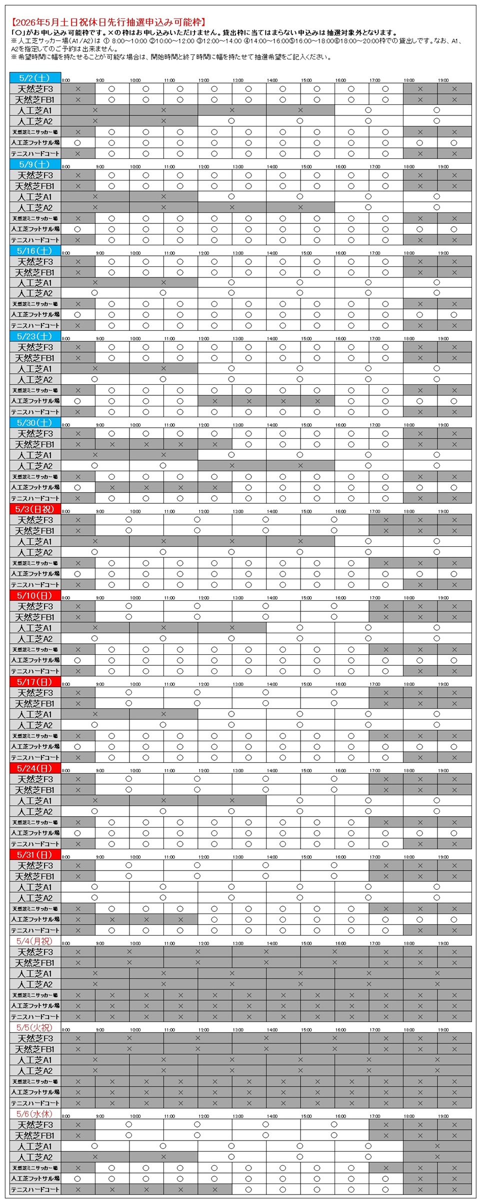 ※サッカー場の抽選申込みは2時間枠での申込み受付となります。