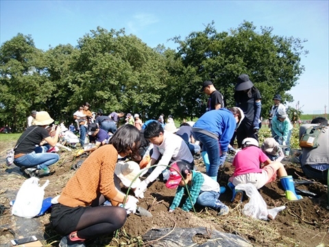サツマイモの収穫、バーベキューを行いました。掘ってみないとどんな風に育ったのか分からないサツマイモ。大人も子どももドキドキしながら掘り、「イモ、あった!」「大きい!」という喜びの声から「不作だ!」「スコップでイモ折れちゃった!」というちょっと残念な声も聞かれました。イモ堀りのあとは、収穫した作物についてやレッズの選手の「食」にまつわるお題のクイズ大会、レッズグッズ抽選会、サツマイモのつるで作った輪投げなどを楽しみ、お昼はみんなでバーベキューを行いました。バーベキューでお腹がいっぱいになったあとは、クイズ大会と収穫したイモの大きさや重さを競う「イモ1(ワン)グランプリ」の表彰を行いました。