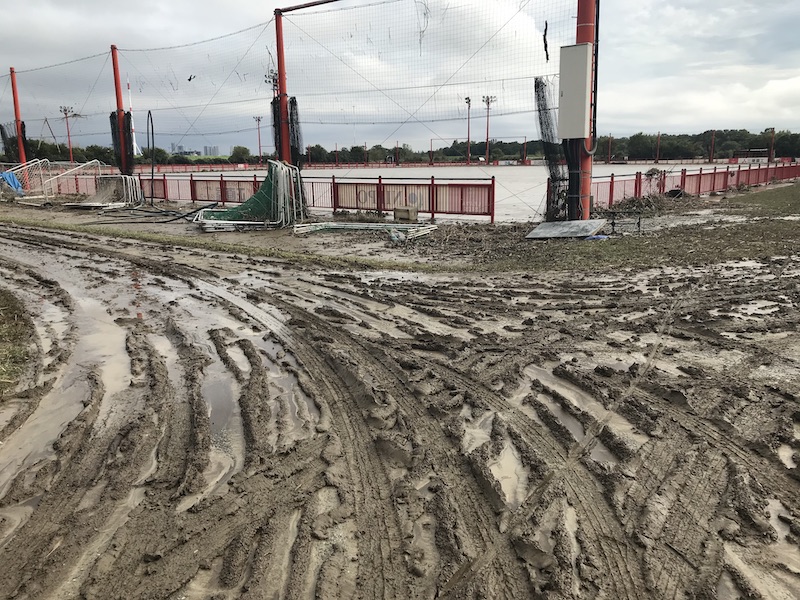・10/19(土)朝方までの雨の影響により、アスファルト上は泥のぬかるみが顕著になりました。乾燥し除去、搬出が可能になるまでは日数を要する見込みです